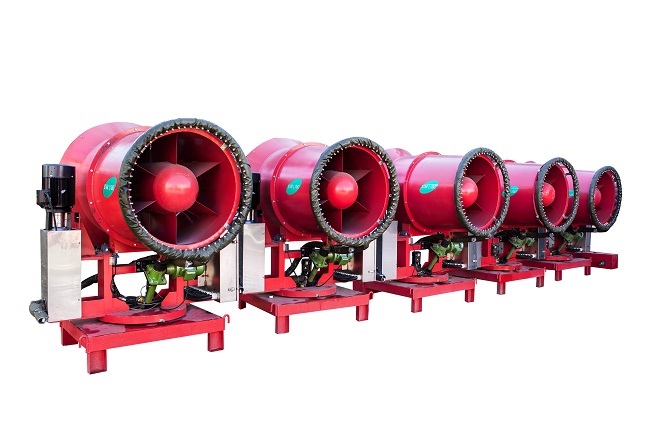 智能射霧器具有霧量大、霧量可調、射程遠、覆蓋面積大等特點,并通過與控制平臺、手機設備、監測設備聯動,實現對起塵點精準抑塵。其中,30微米級遠程射霧器,水霧顆粒直徑更小,功耗更低,抑塵效果更佳。